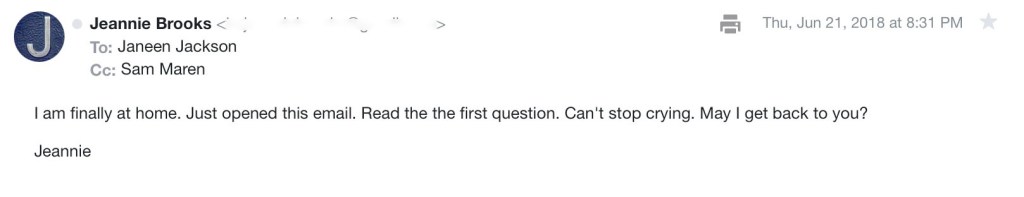 Sam continued to respond to my questions and timeline details. It was fascinating! Jeannie, on the other hand, understandably, wasn’t as enthusiastic.